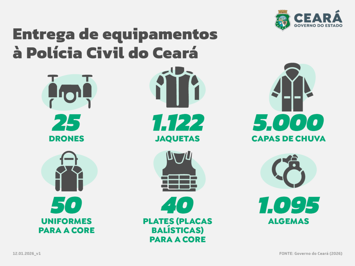 Para reforçar o trabalho na área da Segurança Pública, o Governo do Ceará entregou, nesta segunda-feira (12.01), mais de 7,3 mil equipamentos à Polícia Civil do Ceará (PCCE). A solenidade, realizada no Centro Integrado de Segurança Pública (Cisp), em Fortaleza, contou com a presença do governador Elmano de Freitas, acompanhado do delegado-geral da PCCE, Márcio Gutiérrez, além dos comandantes e dirigentes das Forças de Segurança do Estado.