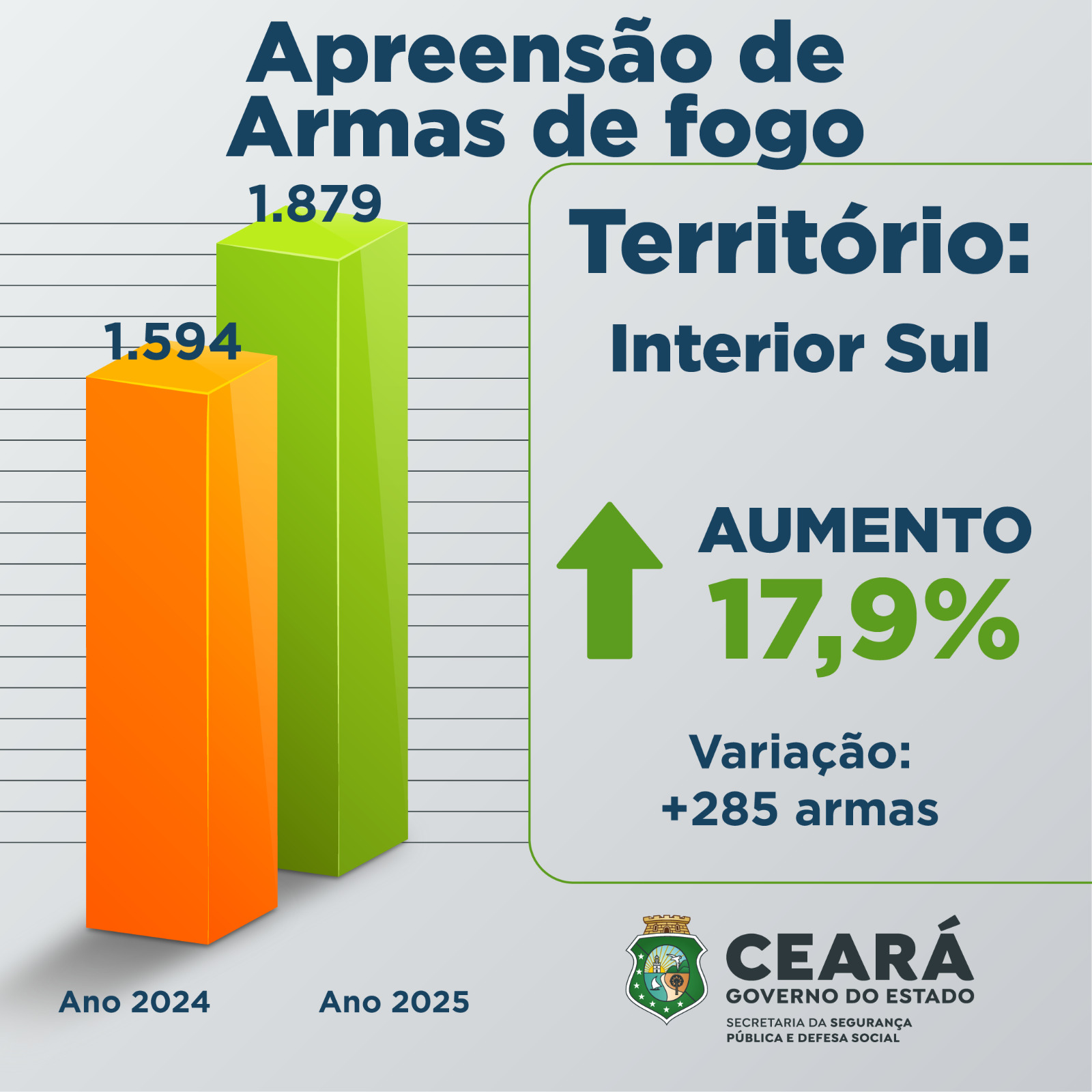 Ainda conforme o levantamento, todas as regiões do Estado, registraram aumento em 2025. Em Fortaleza, o aumento foi de 6,4%, com 1.664 armas de fogo apreendidas entre janeiro e dezembro de 2025. No mesmo período do ano anterior, o número foi de 1.564.