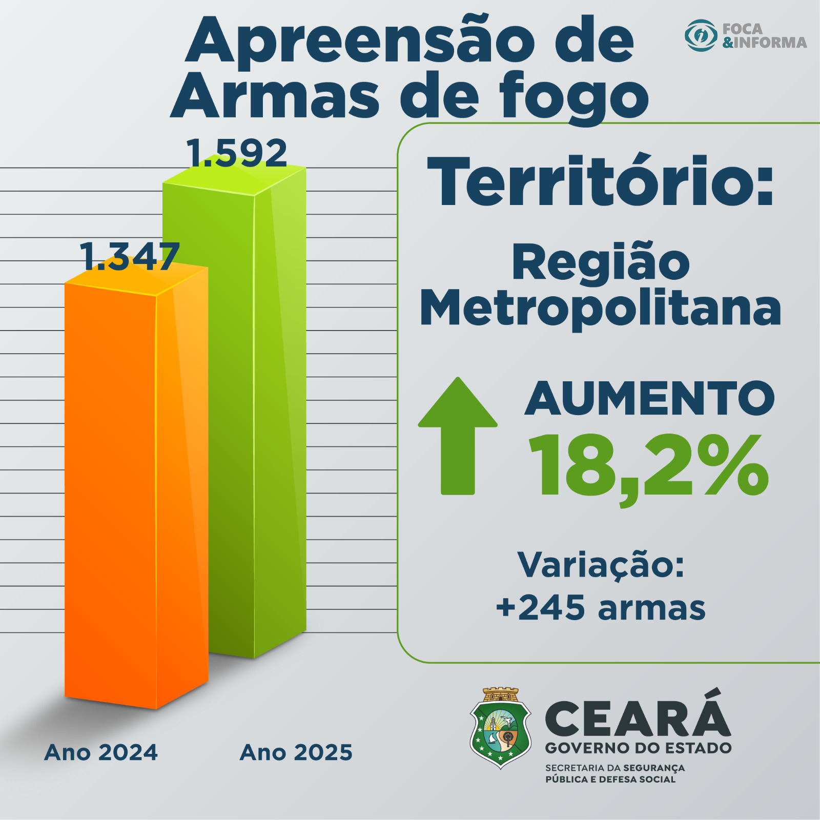 Na Região Metropolitana, o crescimento foi de 18,2%, com 1.592 armas de fogo apreendidas, frente às 1.347 recolhidas pelas Forças de Segurança em 2024.