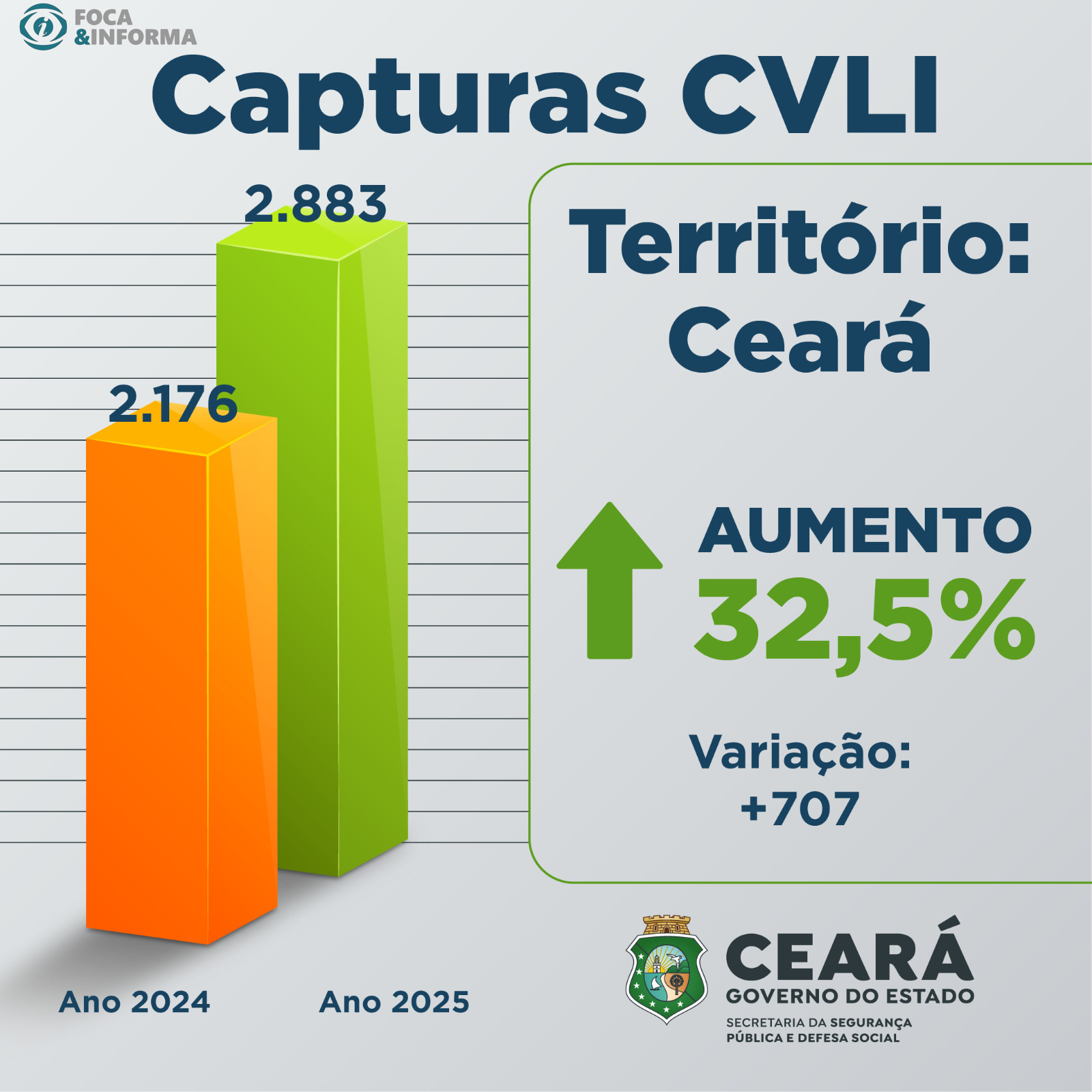 De janeiro a dezembro de 2025, houve aumento de 32,5% nas prisões e apreensões por CVLIs no Ceará, perfazendo um total de 2.883 prisões ou apreensões. O crescimento das capturas aconteceu em todas as regiões do Estado. Em Fortaleza, o incremento foi de 23,7%, com 752 capturas em 2025, contra 608 registros nos doze meses de 2024. Na Região Metropolitana, o aumento foi de 40,8%, com 849 casos em 2025, contra 603 prisões e apreensões de janeiro a dezembro de 2024. No Interior Sul, o aumento foi de 46,5%, com 696 capturas em 2025, contra 475 registros em 2024. Já no Interior Norte, o aumento nas capturas por CVLI foi de 16,8%, com 570 registros em 2025, contra 488 capturas em flagrante e por mandado, entre janeiro e dezembro de 2024.